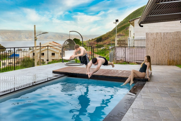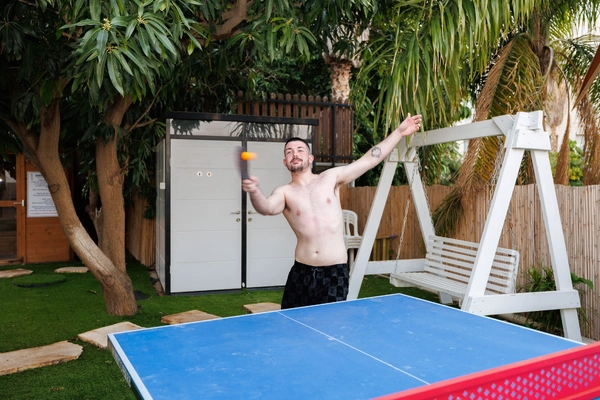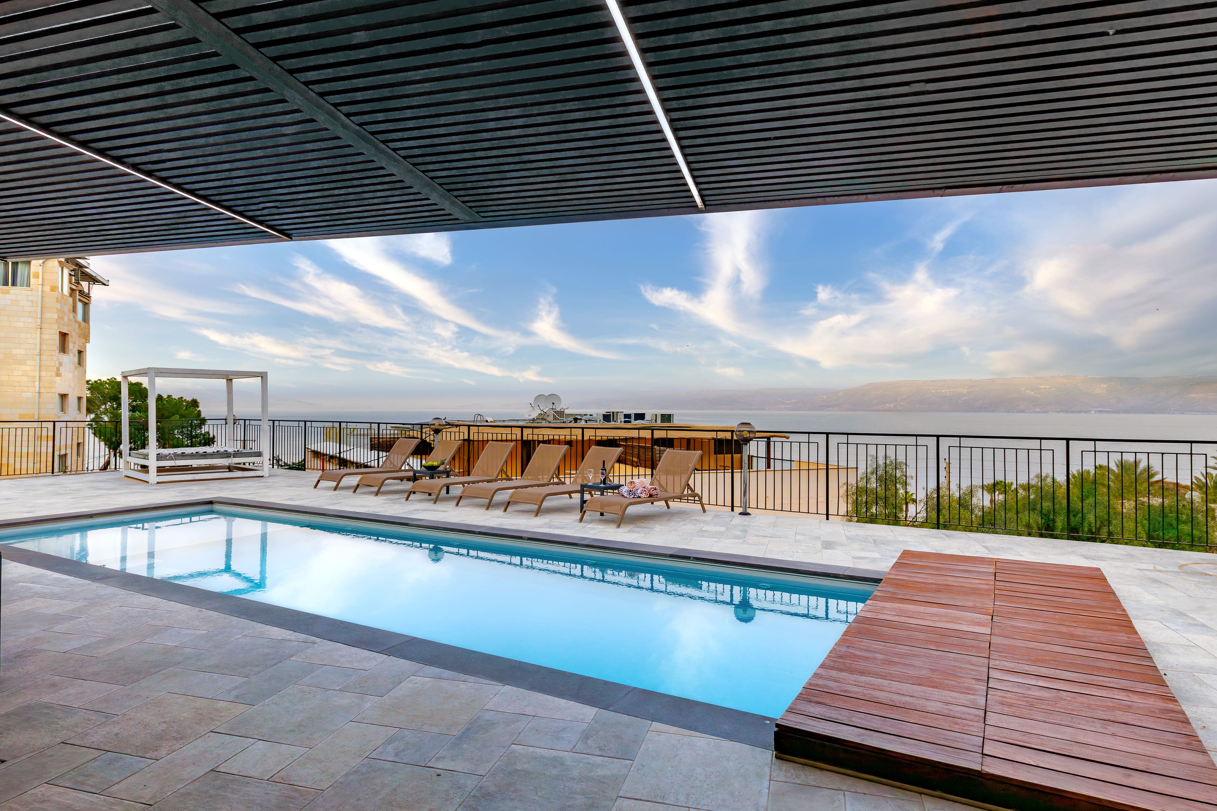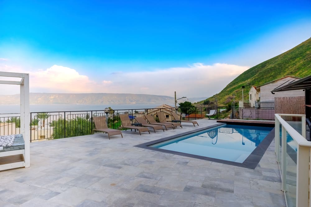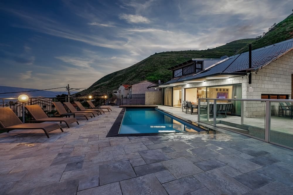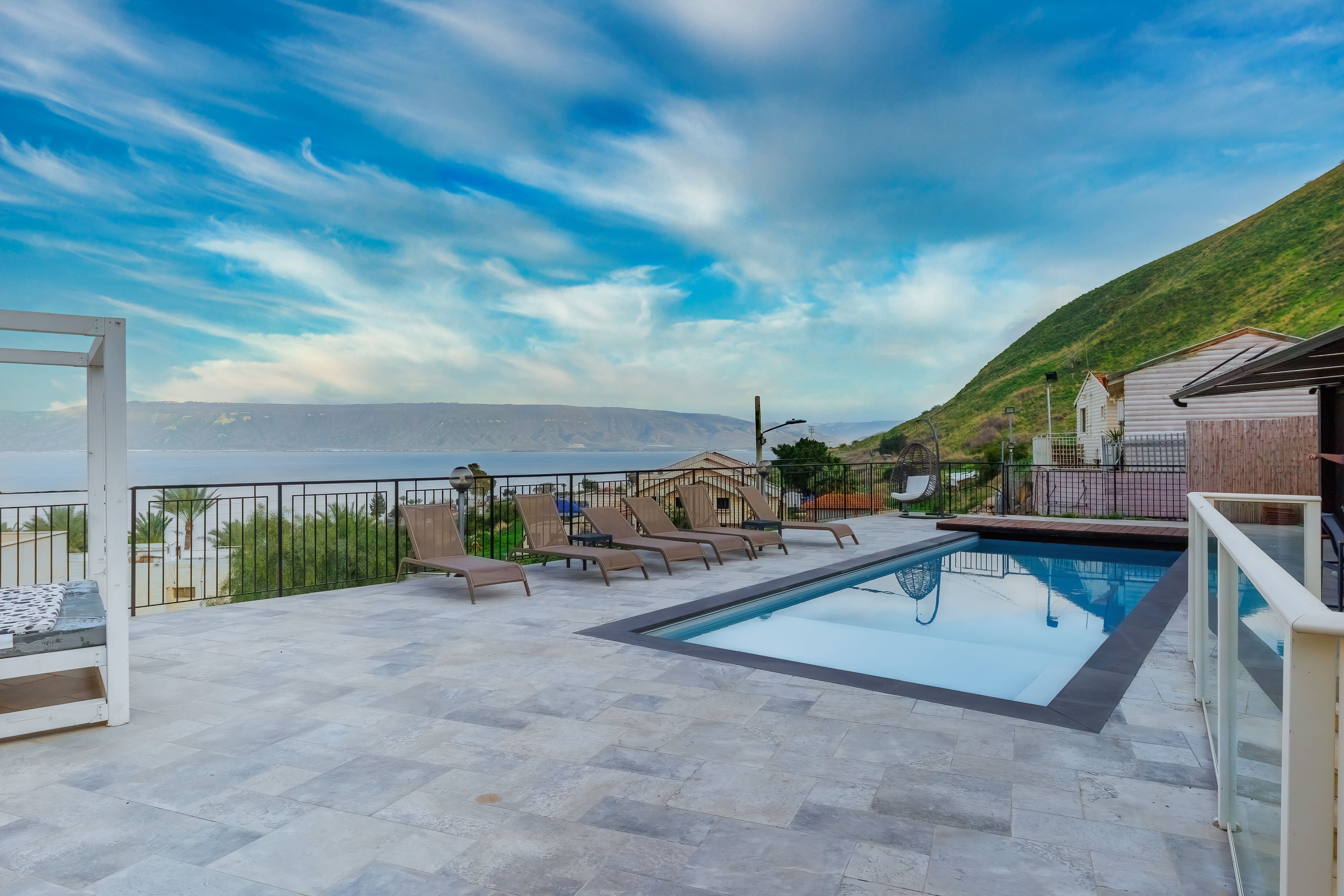 Бассейн с видом на Кинерет. Зоны отдыха: шезлонги, кровати для загара, качели. Душевая на улице– после сауны или бассейна. Электрическая сауна (4 чел.). Теннисный стол. Зона барбекю: