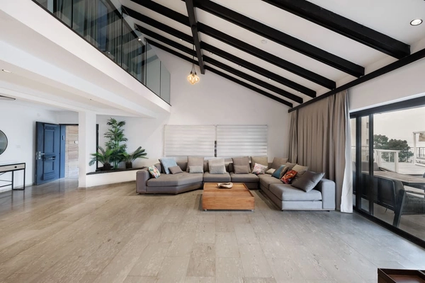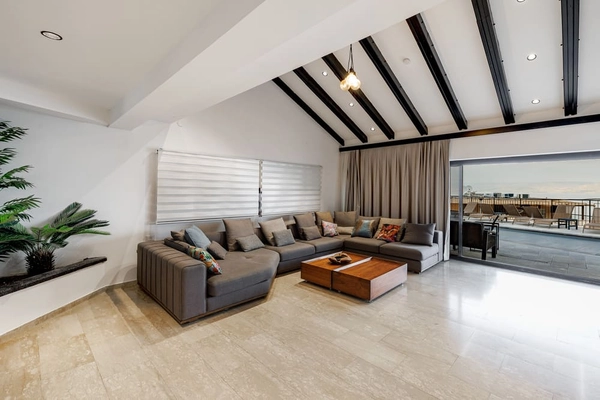 Просторный салон с панорамными окнами, выходящими на балкон и территорию виллы. Угловой диван на 10–15 человек. Большой телевизор.