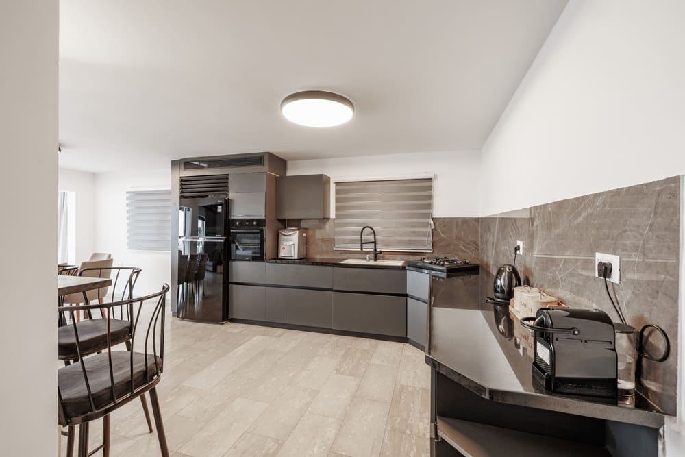 Оборудованная кухня с современной техникой, посудой и кофемашиной.